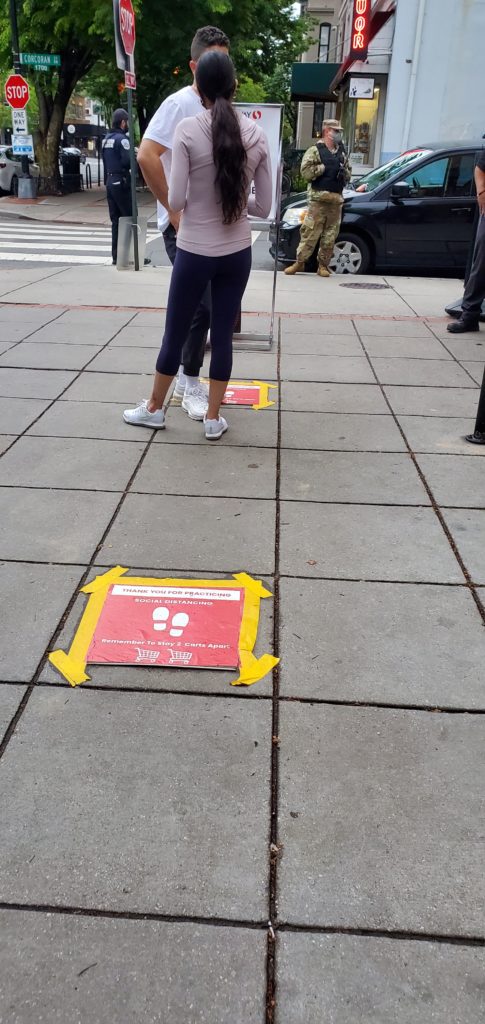 Ed. Note: We’ve noted a National Guard presence at some NPS run parks but this is the first report we’ve gotten from outside a business. I’m guessing they are just helping police enforce the ‘you must wear a mask’ before entering a grocery store rule. Anyone else see the National Guard posted at spots besides parks?