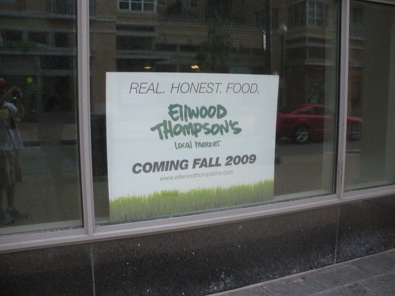 A few readers have been asking for an update on the status of the Ellwood Thompson’s arrival to the DC USA mall in Columbia Heights. I’m happy to report that a source has alerted me to the fact that their permits have officially been submitted to the DC government. So this is a step in the right direction. However, my other sources tell me that there is still a long road ahead before the store opens its doors. Sadly I don’t have a timeline but I promise to keep updating as developments are made. If I had to guess I would think an arrival in 2011 is more likely than a 2010 arrival. Perhaps a new sign is in order… But overall I think this is good news because it is some tangible evidence to show us that the deal is not dead.