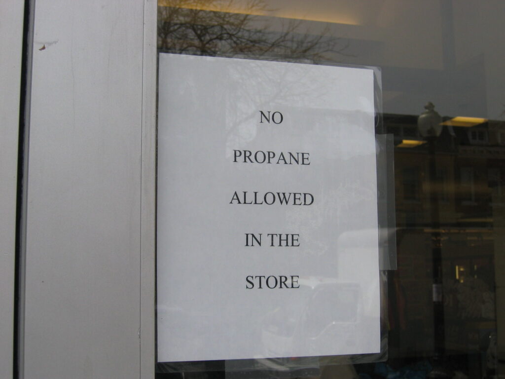Props to the eagle eyes on our intern in Columbia Heights, Karen, for spotting this sign outside the Giant in the Tivoli. I’m pretty sure you can bring propane in the six feet under Safeway…