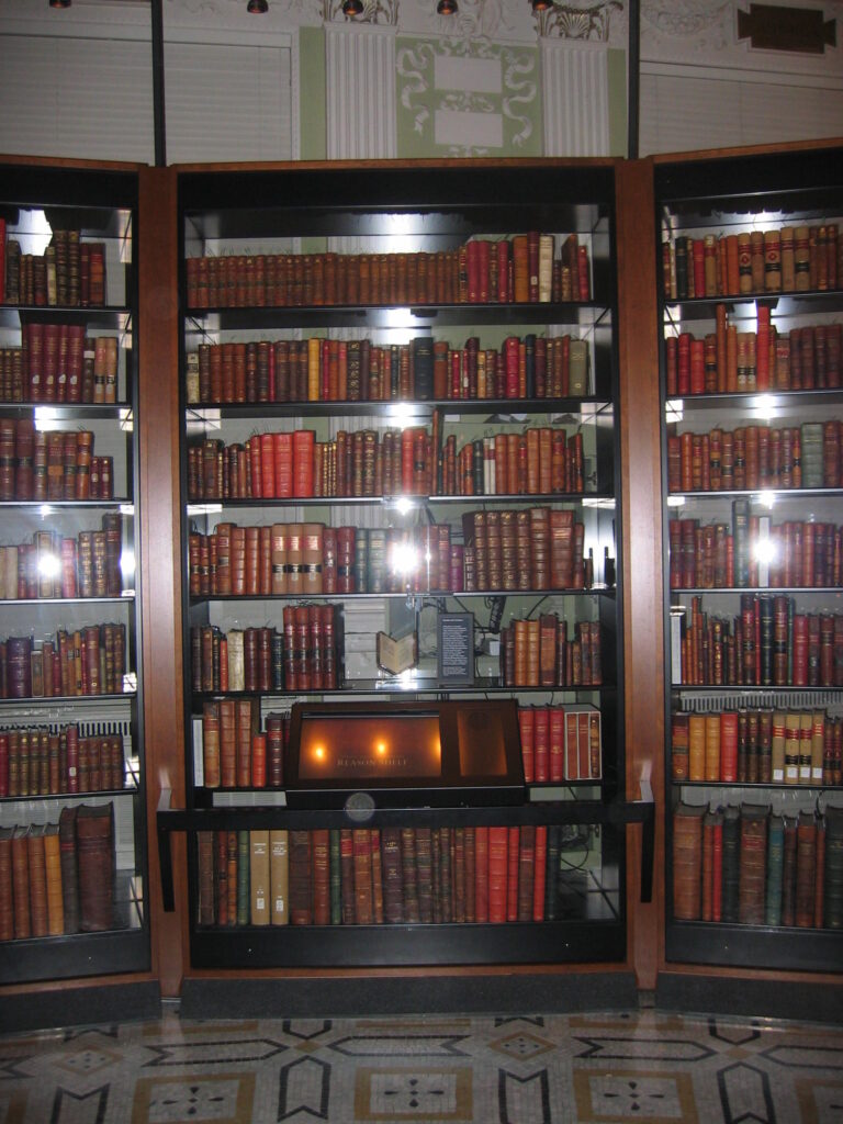 Personally, I though Thomas Jefferson’s Library was by far the coolest. The picture above is part of his Library. There are 6,487 volumes divided between History, Philosophy and Fine Arts. I spoke with the Chief of Rare Book and Special Collections, Mark Dimunation, who explained that in 1851 there was a fire that burned 2/3 of Jefferson’s Library. The surviving third are located in this exhibit. Additionally, the 2/3 that burned have been replaced with originals when possible. Dimunation explained that the original Jefferson books are distinguished by a green ribbon. It is also interesting to note that this collection is active and can be accessed by researchers. But what is really cool about this exhibit is the interactive feature. You can see a computer screen in the above photo (lots more photos after the jump) and at the computer you can pick any book in the collection and “turn” the pages and have foreign volumes translated. It is super cool.