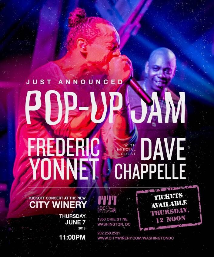 “City Winery Washington D.C. (1350 Okie St NE) is thrilled to announce a surprise late show following the DC Jazz Festival® (DC JazzFest) Opening Ceremony today, Thursday, June 7, featuring a very special appearance by legendary comedian, writer, actor & producer Dave Chappelle, who is about to embark on a seven show, three city tour with Jon Stewart. Chappelle will join longtime friend and musician Frederic Yonnet beginning at 11:00pm. Hot off the heels of two Netflix specials and a Grammy Award for Best Comedy Album, Chappelle brings his unparalleled talents back to his hometown, Washington DC, for this special night. Chappelle’s appearance in City Winery’s intimate venue is a part of the special programming bringing excitement and energy to Washington’s Ivy City neighborhood this year.