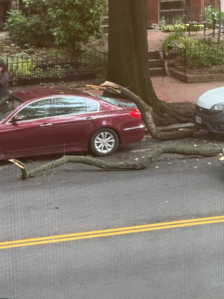 Branches fell and hit this parked car as well as a car driving by.