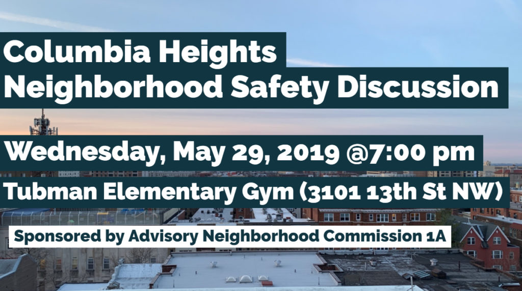 “In response to the recent increase in gun violence in our community and the urgent need to get answers and find solutions, Advisory Neighborhood Commission 1A has organized a panel for tonight where we can get updates on the efforts being undertaken to restore safety to our community. The event is scheduled for tonight (5/29) beginning at 7 pm. It will be held in the gymnasium of the Harriet Tubman Elementary School.