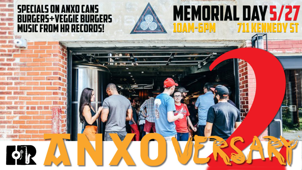 “We are really excited to celebrate two years of our Kennedy St location this Monday, May 27th (Memorial Day). We will be open for extra hours from 10am-6pm, and in addition to our normal food menu we will be grilling ANXO-style burgers and veggie burgers outside. HR Records from across the street will be spinning records and we will have ANXO can specials going all day, should be a ton of fun!”