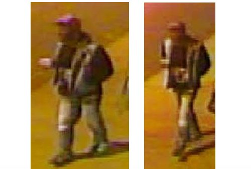 The suspect is described as a black male, with a dark complexion and a full beard. He is approximately 6′ tall. He was last seen wearing blue jeans and a denim vest. The suspect was captured by nearby surveillance video and can be seen in the photos above.