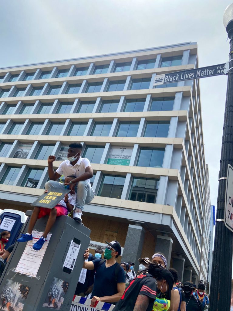 Thanks to Sandra for sending: “I was walking down 9th street NW between F and G and noticed loud music playing in solidarity with today’s protests coming from one of the apartments above Shake Shake. I hope those participating in today’s protest get the chance to stop by and listen.”
