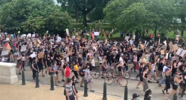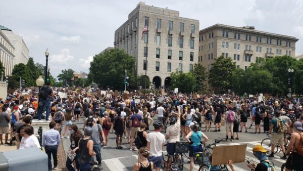 Protesters gathering near Dirksen. Police beginning to close off roads to traffic. Still space to social distance. Lots of snacks/water stations around. #BlackLivesMatterDC @PoPville pic.twitter.com/uqe4LC1weB