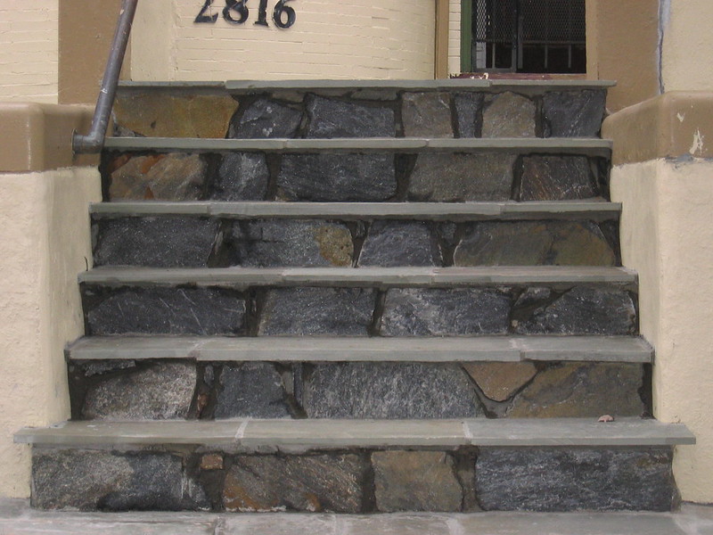 My steps are decrepit. The are very boring concrete with dozens of cracks. So how would you fix them? I like this example of slate and stone. But I also like red brick. What do you think are the best enhancements to steps?