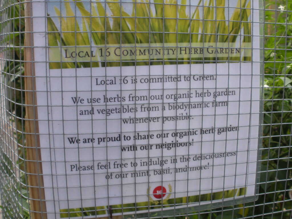 I’ve always liked Local 16 located on U Street just west of 16th Street. I believe they have one of the best roof decks in the city and this only adds to the allure. The sign says they are happy to share their herb garden. Nice. It also says they use “vegetables from a biodynamic farm whenever possible.” So I guess I’m wondering what exactly makes a restaurant green? Is using vegetables from a biodynamic farm as well as herbs from an herb garden enough to proclaim oneself green? I do think it’s cool that they share the herbs with their neighbors, I’m just curious about the new trend of folks calling themselves “green”.