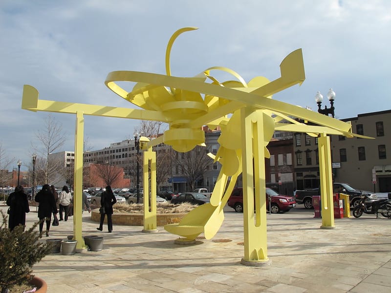David Black is internationally renowned for his monumental pavilion-like public sculptures. Black’s dynamic, architectural enclosures interact with the surrounding environment creating movement and interacting with each unique environment. Black installed Lift Off in November which is adjacent to the 5th and K Busboys and Poets outdoor cafe. According to Black, the sculpture was inspired by children flying kites on the National Mall. “It’s to appear kinetic as one passes by–reflecting the spirit and vibrancy of the new neighborhood,” said Black. This piece was commissioned to encourage people to use and interact with the public plaza. Life Off includes a love seat for anyone needing a respite or enjoys a quick lunch outside under the shadows of Lift Off.