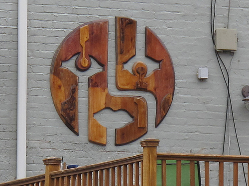 We’ve seen a few chicken/rooster sculptures before but this is the first welcome chicken. Awesome. From Kalorama.