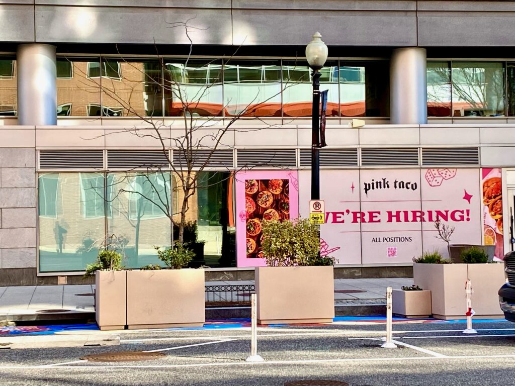 Thanks to Jason (and others) for the Pink Taco update: “Well that didn’t take long…. Guess they got the message. Ha window on the left is where the DC isn’t a state sign was.”