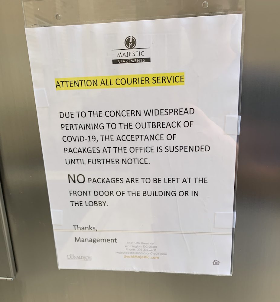 So I was unable to get medication/items from Amazon delivered this morning, FedEx said that they had been sent away. I was very confused about this until I went to my apartment door and found this sign. Is this even legal? Is this something that is going around do you see? I’m so confused, we’re being told to stay at our houses and stay inside. But my complex is blocking that.”
