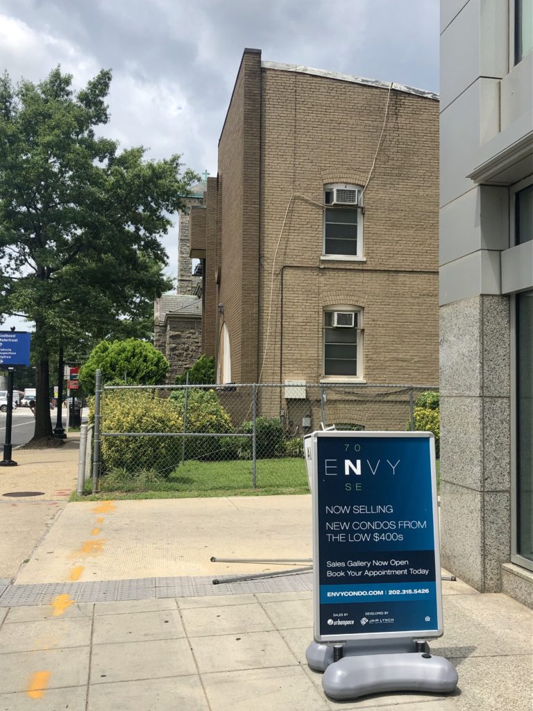 I’ve been meeting to write in about this for a few weeks but finally got around to it after seeing the Kelvin post. Placement of this sign on M St. & South Capitol St. SE for the new Envy condo building made me snort-laugh walking home from work the other day–it’s right next to a Catholic church. Maybe the developer was thinking that once residents buy into “a lifestyle to covet” (their language, not mine) they’ll hit up Saint Vincent De Paul to repent? I get that they’re trying to play off the N St. address, but seriously… smh.”