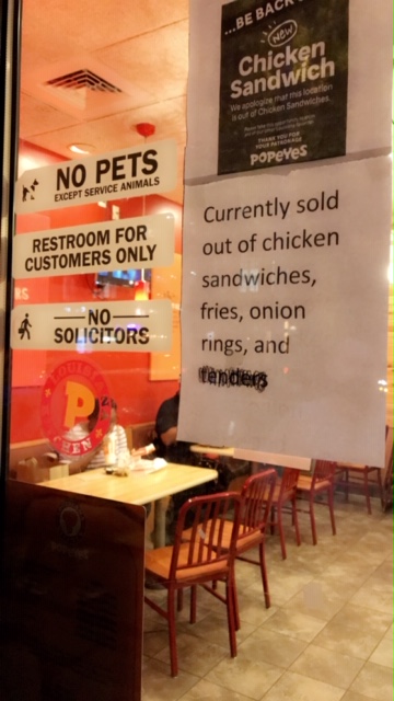 Thanks to J. for sending from the 14th Street Popeyes: “I understand the chicken sandwich…. BUT FRIES!?”