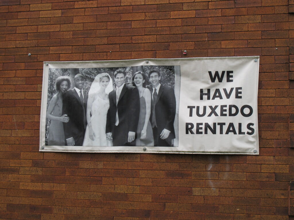 Maybe I just think of Tuxedos as the James Bond style but this sign cracked me up because from a distance it looked like everyone was wearing regular suits…