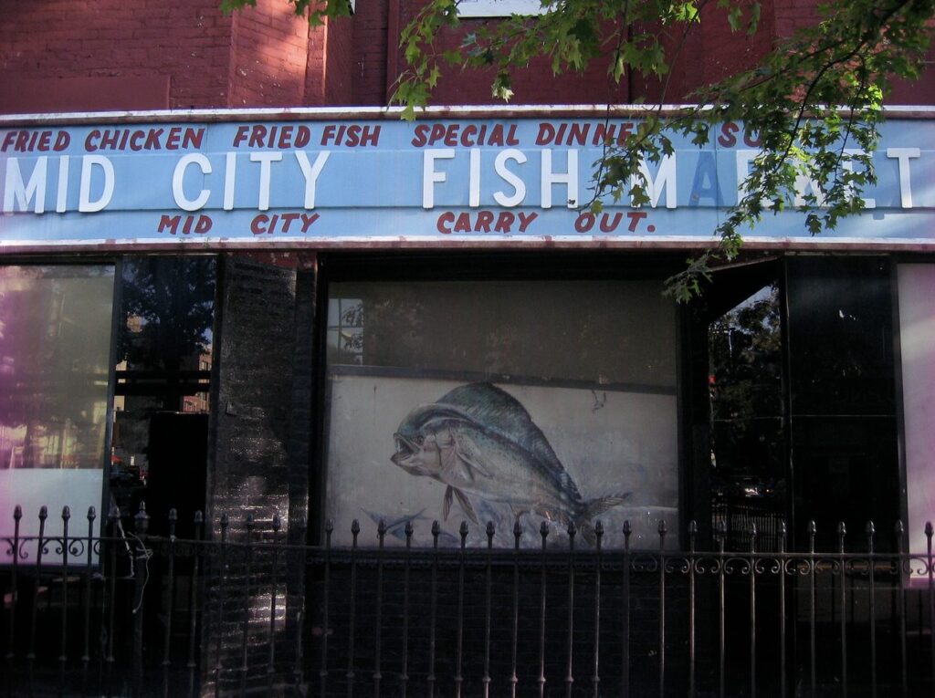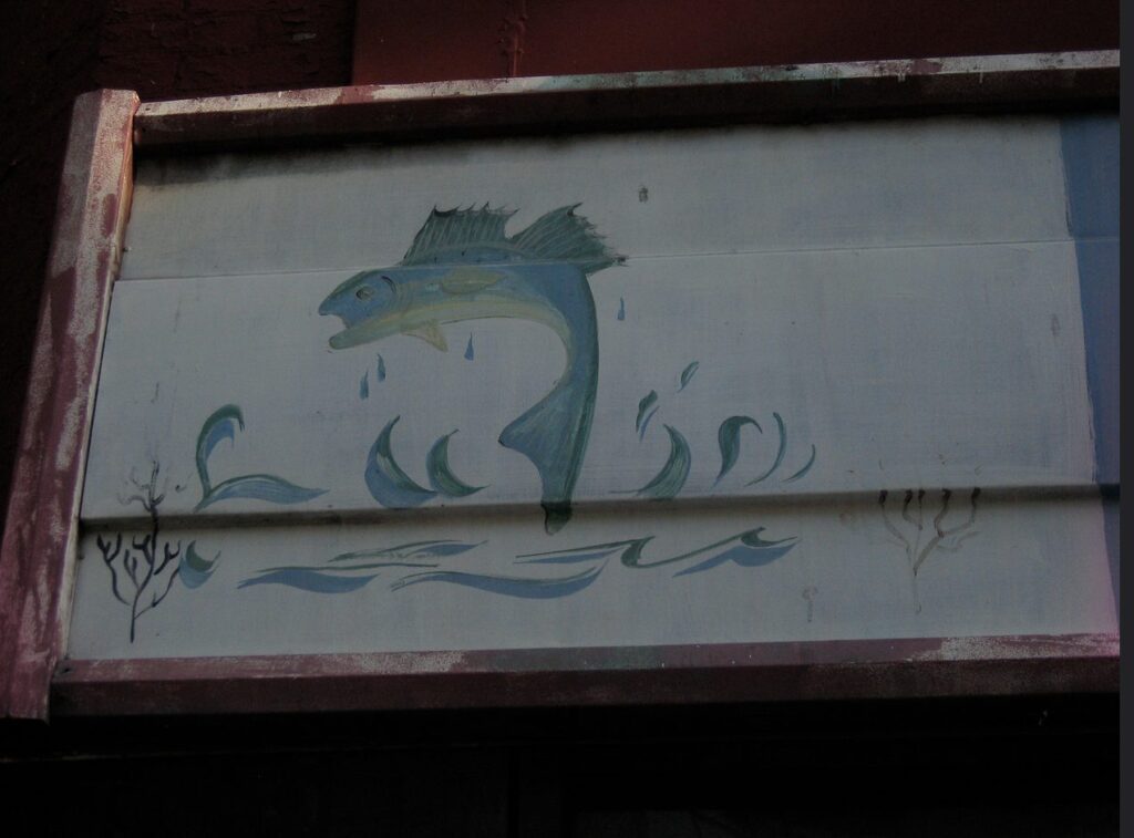 “I don’t know if this qualifies as a sweet city sign, and maybe you’ve shown it before, but I just love the mural of the giant fish leaping in the air. I couldn’t fit it in the pic, but directly to the left of the lettering is the painting of the smaller fish. Not as well depicted, but endearing in its own way. The building is located on the Southwest corner of P and 14th. And then just to keep with the fish theme, I thought I’d include an international sweet city sign, from the Notting Hill area of London.”