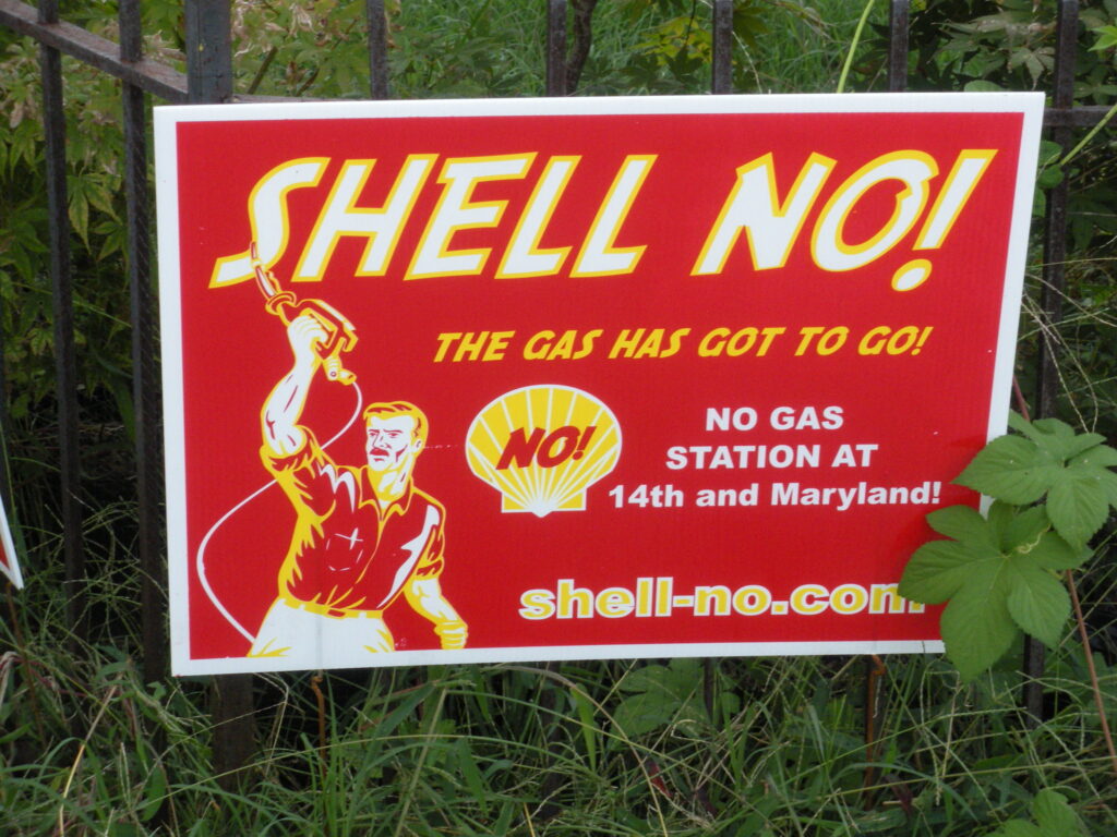 I noticed this sign when I was walking around the H Street area. (This sign was actually spotted on Maryland Ave a couple blocks away from H Street.) Pretty cool sign by the by. Do you think there is opposition because folks would rather have a grocery store or something like that? Would you oppose a new gas station near your home?