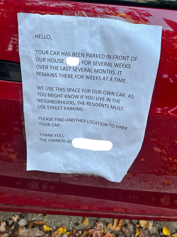 “Residents mad that someone with a valid Residential Parking Permit is using the permit. Three printed pieces of paper on this car saying the same thing.”