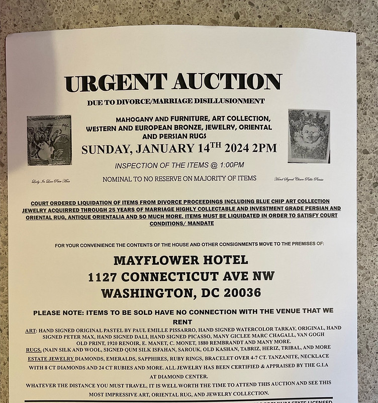 My partner got this weird message in the mail advertising a huge estate sale due to a divorce, including huge name artists like Picasso. We weren’t looking to buy anything, but went to go look at cool art and meet the weird character who wrote this message (pictured above.)
