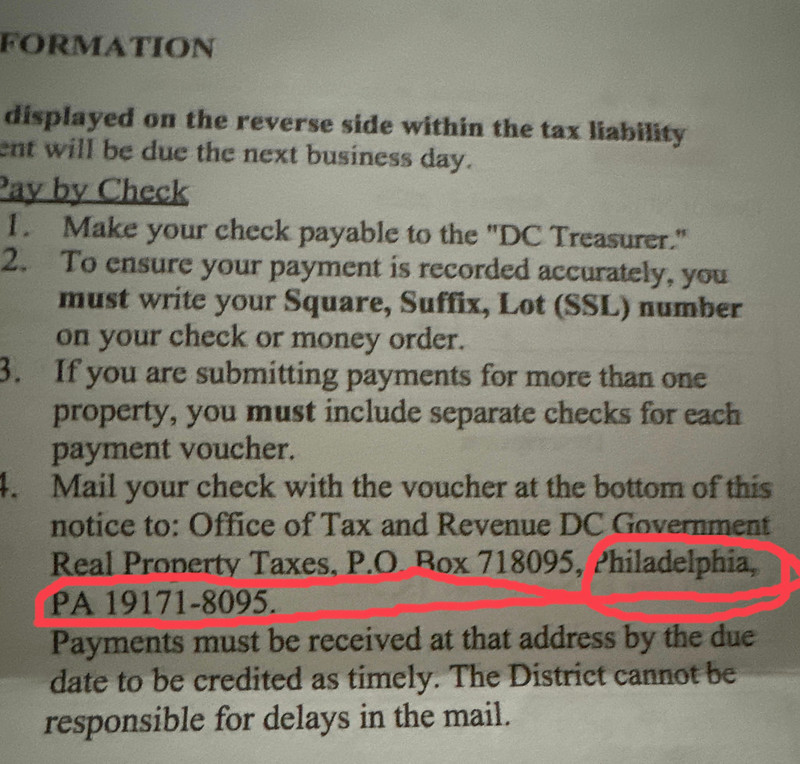 Just noticed this year’s DC property tax address for check submission is in Philadelphia; did they contract this out? I looked and last year’s address was in DC. Seems odd.
