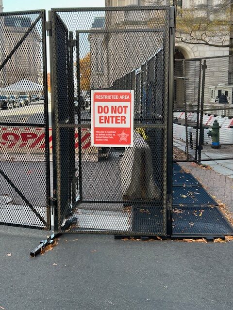 Thanks to Joe for sending: “Sand trucks and fencing around the block of Waldorf Astoria.”