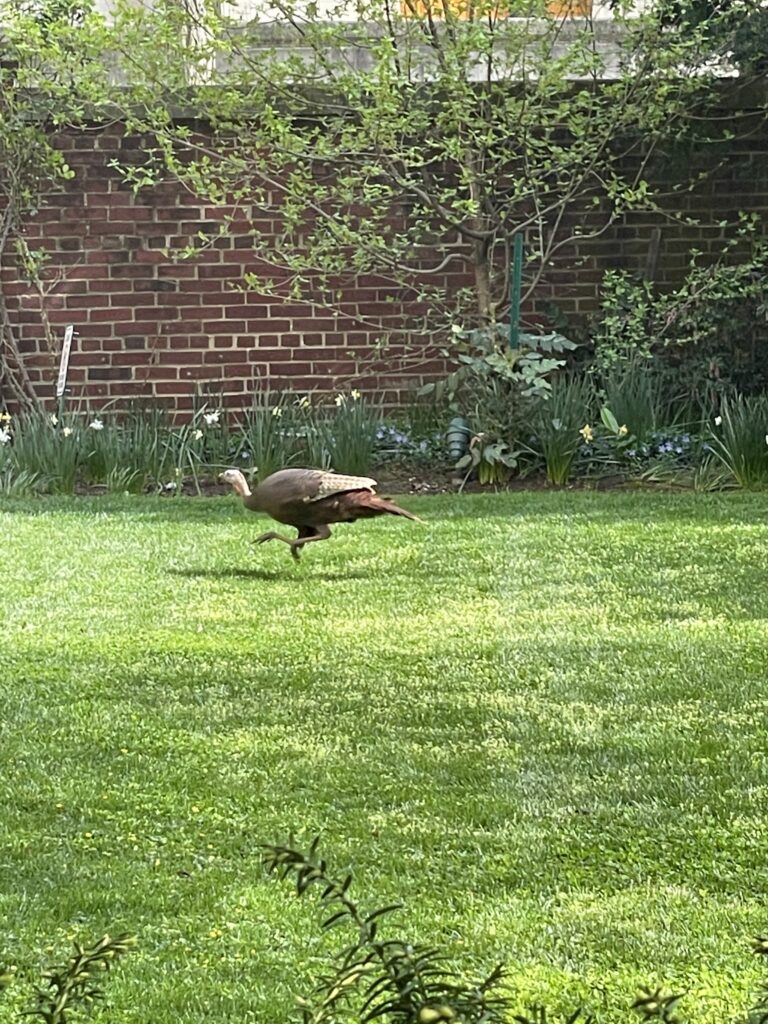 And thanks to Sam for sending from in front of Dannie’s this morning: “A Wild Turkey waiting for breakfast”