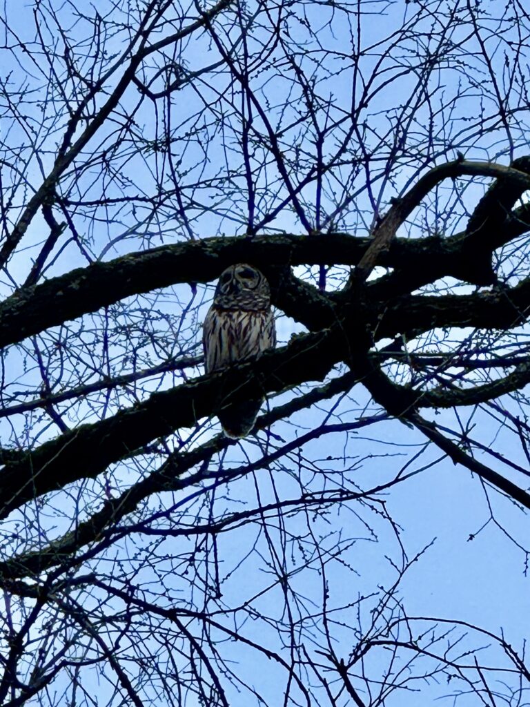 Thanks to Roxanne for sending: “This owl was spotted on Beach Drive in Rock Creek Park.”