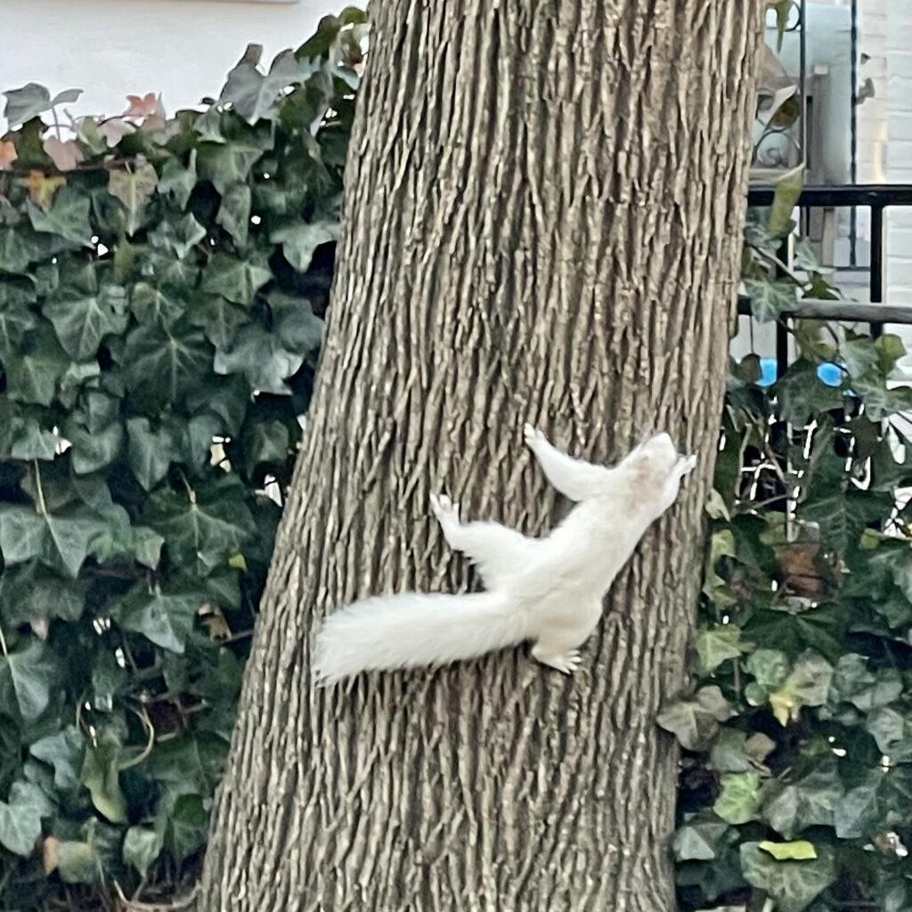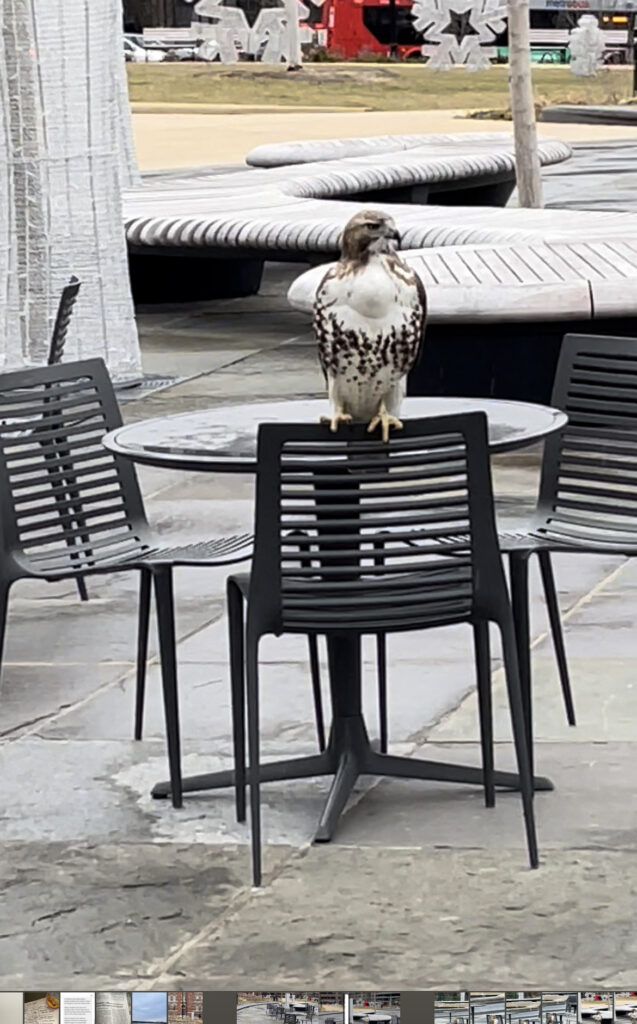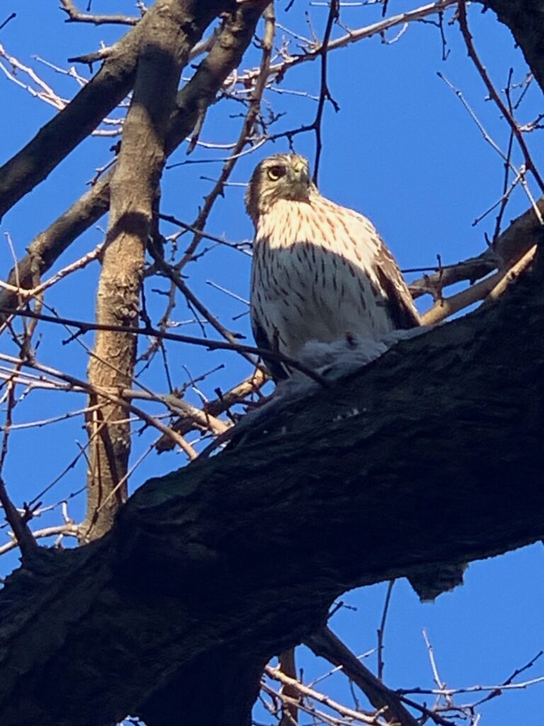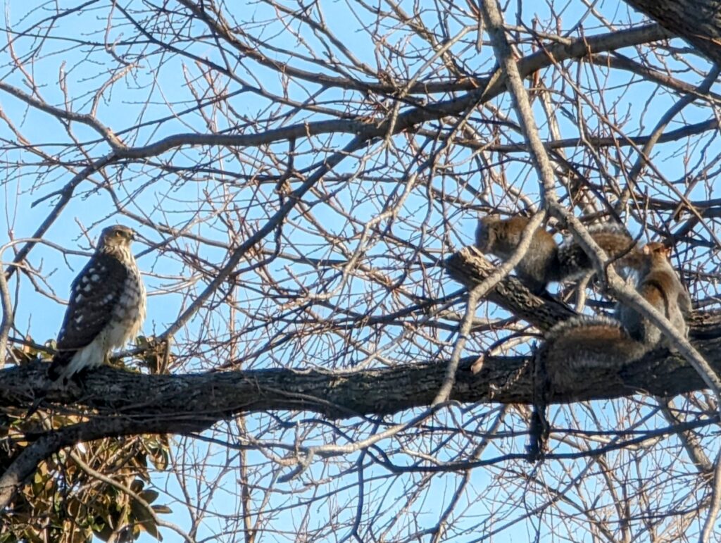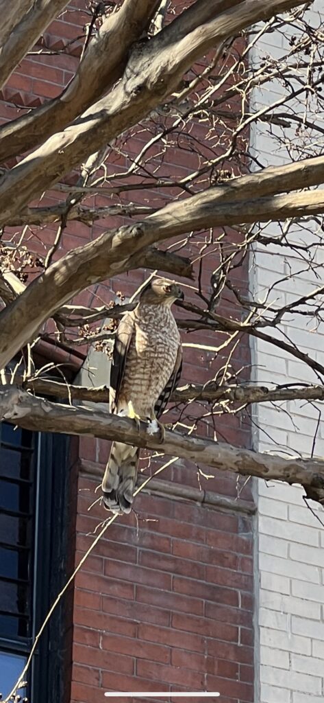 “This guy was in Brentwood this week–he dove at a white whale. I’m happy to report the squirrel survived! (Not because I want the hawk to starve, I just love watching the white whale run around the alley.)”