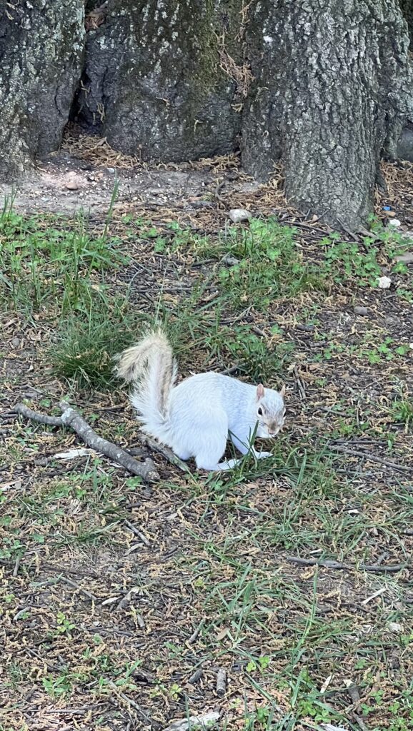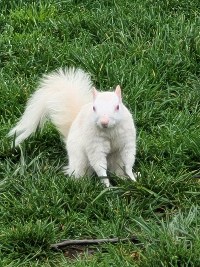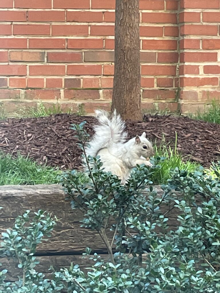 Thanks to Jeffrey for sending this great shot of “Snowy D. Squirrel” from Capitol Hill “back to feast on walnuts for the fifth straight year…”.