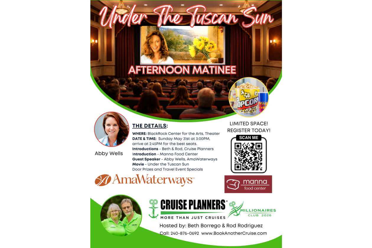 Light refreshments will be served, and guests can participate in a raffle benefiting Manna Food Center. A $5 per person donation is requested, with Cruise Planners Beth & Rod proudly matching donations up to $500. Non-perishable food donations are also welcome.