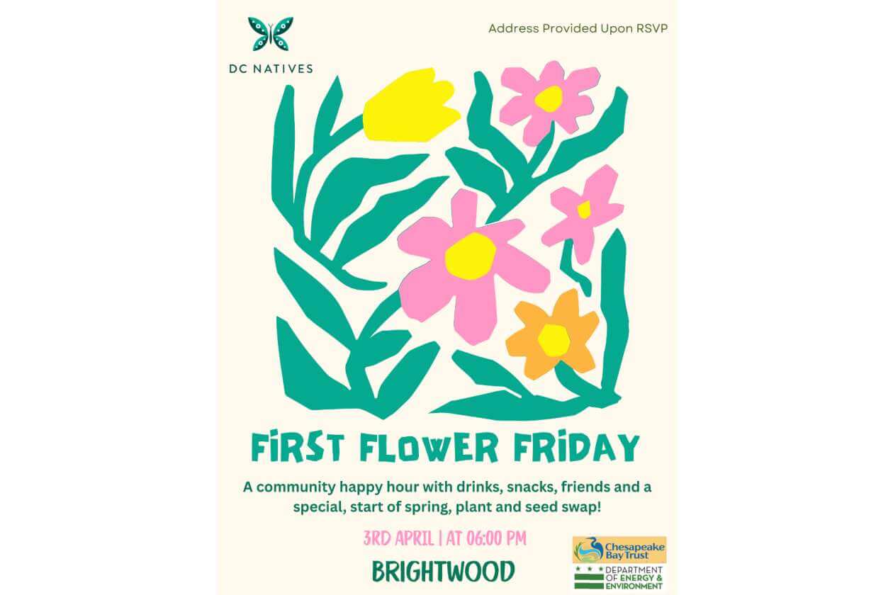 Come celebrate the arrival of spring with DC Natives (DCN) on April 3 at 6pm for a pet and child friendly gathering to build community, share small bites & drinks, and participate in a seed & plant swap at 2026’s inaugural First Flower Friday (FFF) social gathering! We’re kicking off this year’s FFF series of events in Brightwood at one of our most successful residential garden installations in recent years. Please register through the event link to get exact address and help DCN ensure there are enough refreshments for all attendees.
