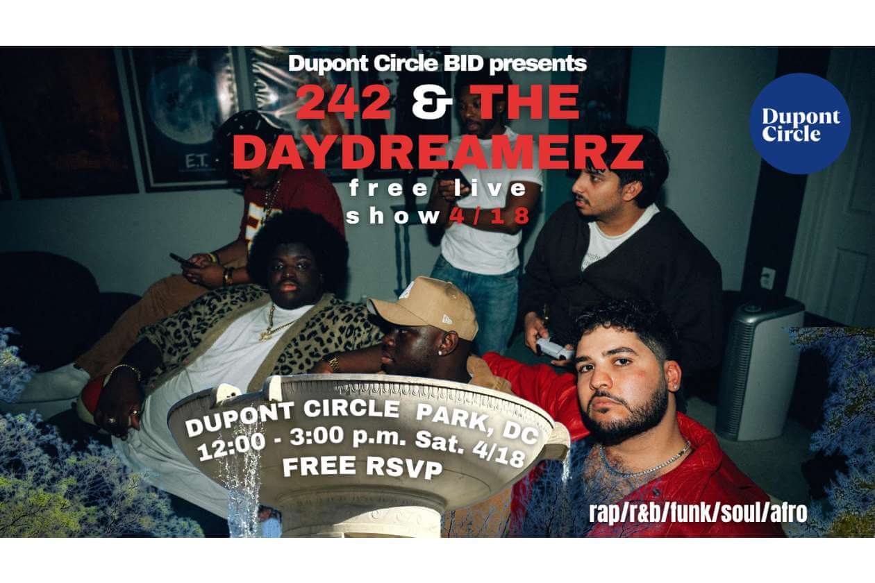 On Saturday, April 18th, we will be joined by 242 and The Daydreamerz. 242 is a Maryland-based music collective known for their innovative sound, thought-provoking lyrics, and unwavering commitment to representing the essence of their community through music. The group’s diverse background, including West African, African-American, Hispanic, Asian, and Middle Eastern influences allows them to incorporate elements of culture into their music. Expertly fusing hip-hop, R&B, pop, and afro sounds, their music feels fresh and original with every listen.