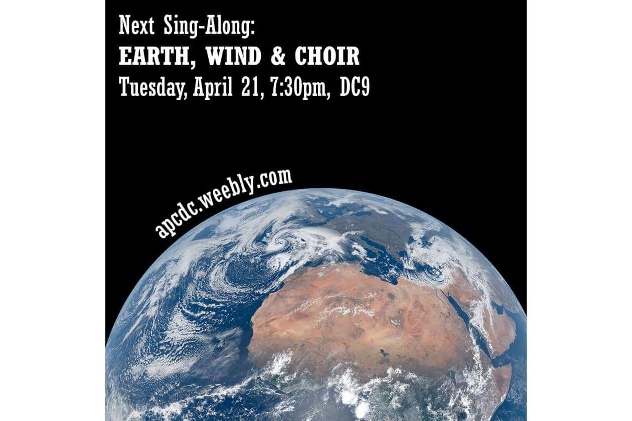 A People’s Choir DC is a themed sing-along. The theme for our April sing-along is “Earth, Wind & Choir” – We’ll be singing songs that invoke the natural elements of earth, wind, fire, or water (or Earth in general). Learn more, RSVP, and submit your song ideas on the website: apcdc.weebly.com. It’s free! Hope to see you there.