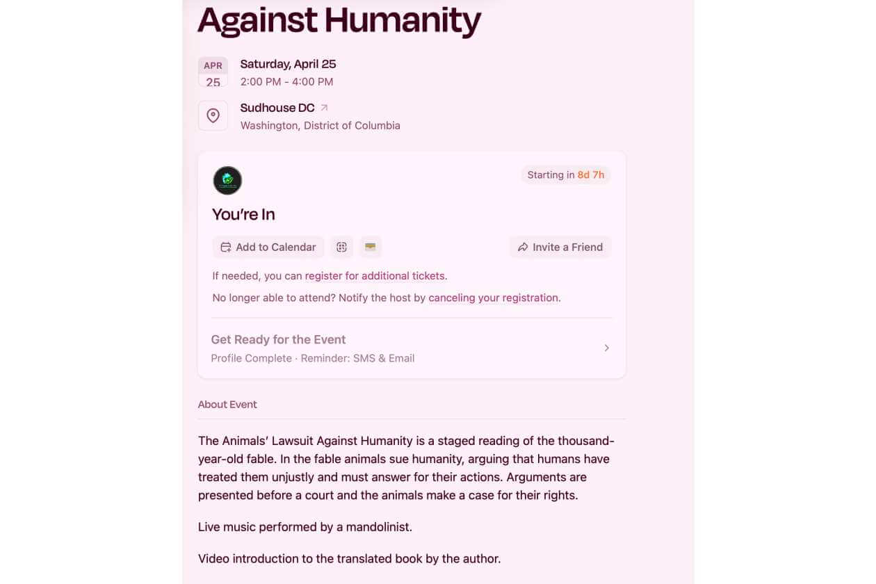 The Animals’ Lawsuit Against Humanity is a staged reading of the thousand-year-old fable. In the fable animals sue humanity, arguing that humans have treated them unjustly and must answer for their actions. Arguments are presented before a court and the animals make a case for their rights.