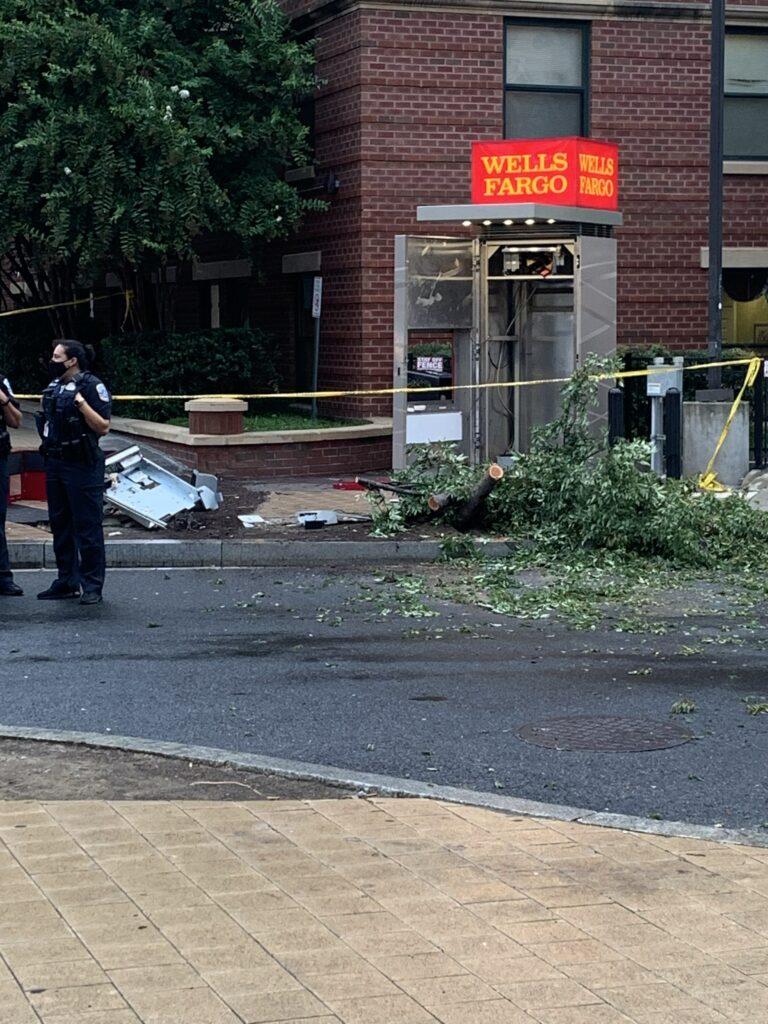 “At Adams Morgan Plaza NOW! 18th St NW and Columbia Rd: Police, Protesters, homeless, Truist (SunTrust/BB&T) Bank officials, vested workers with chain link fences, and a police van seen circling.”