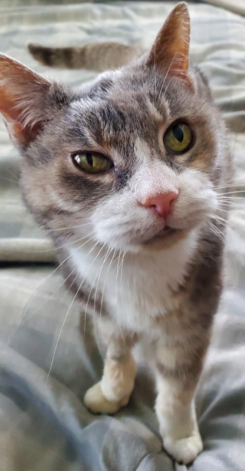 She’s a petite senior girl with a demanding meow (and sometimes the most adorable squeaks) when she wants food, treats, or to play, and a little whisper meow paired with head-bonks when she wants attention or a lap snuggle. She especially likes to lie half-on and half-off a lap.