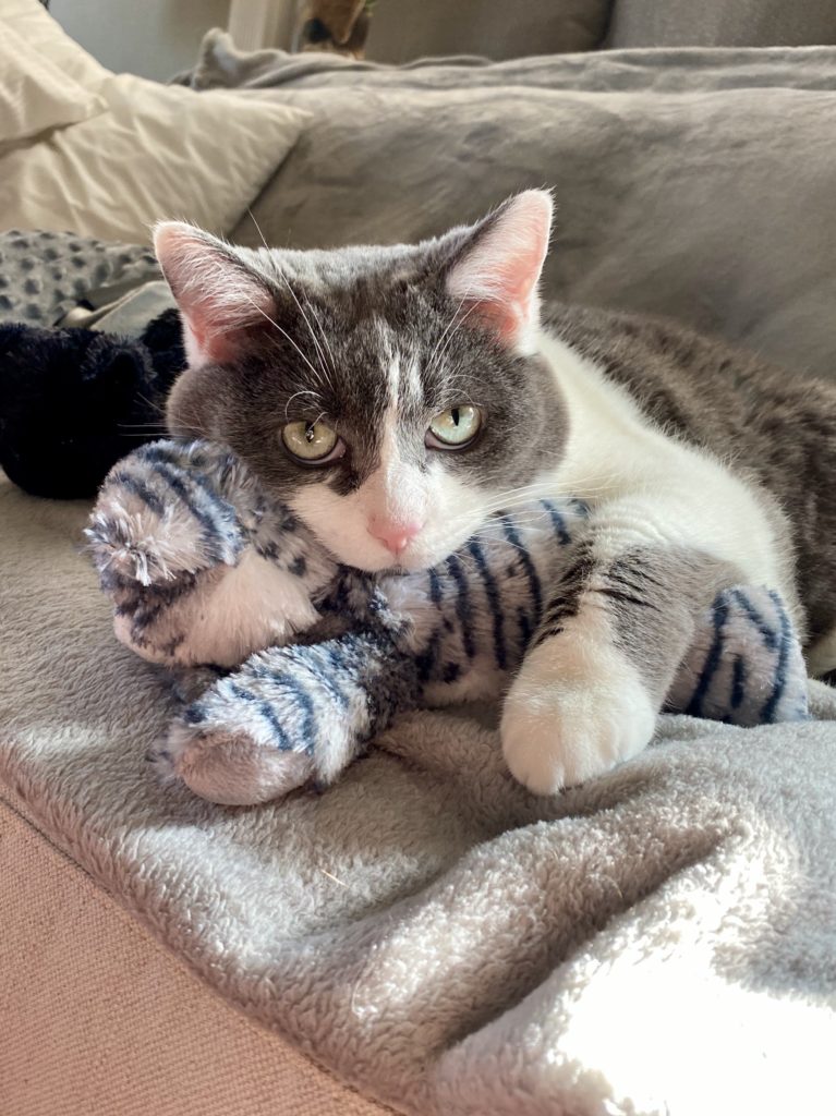 “Megs enjoying some cuddles with her new favorite toy.”