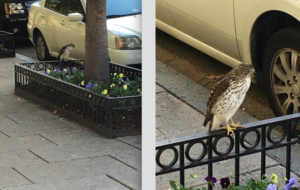 “Walked right up to him, and he didn’t move for almost a minute. Turns out he was stalking a small mouse, who darted out from under a car soon after, and the hawk hopped after him into the tree box. It was wild.”