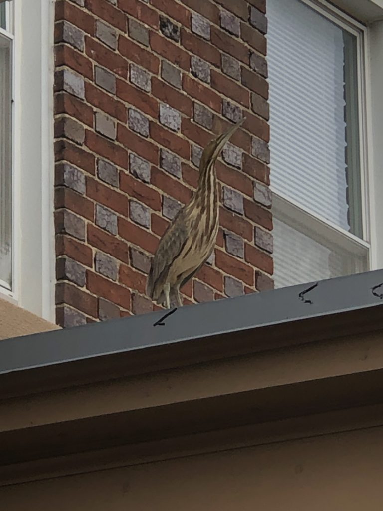 “OMG the rarity of that is unbelievable! American Bittern. It’s a kind of heron. I’ve never seen one in DC. In fact I’ve only ever seen TWO. They’re incredibly secretive. Those stripes on his neck mimic reeds. They stick their neck straight up and sway to blend in. If he’s in a marsh you’ll never see it. Looks like he was trying to hide!”