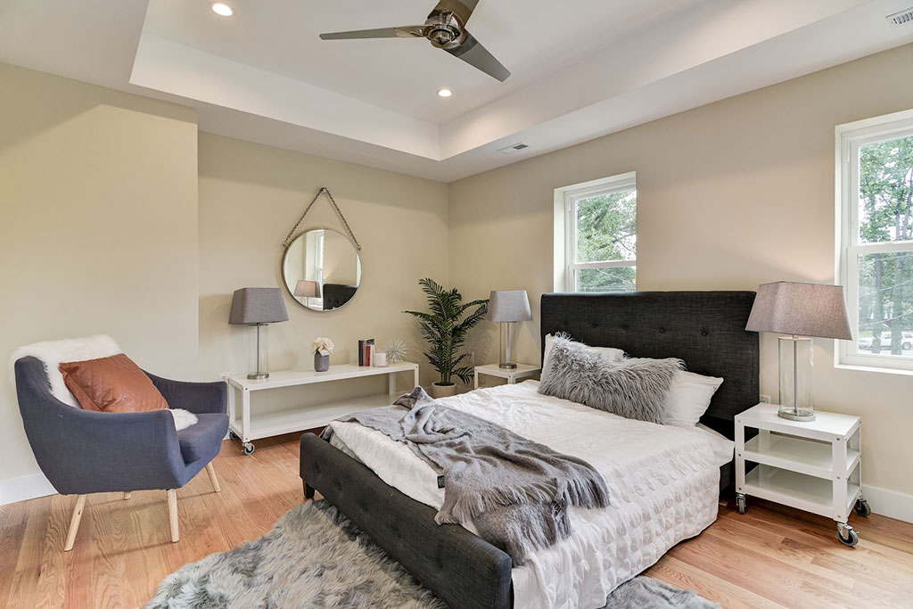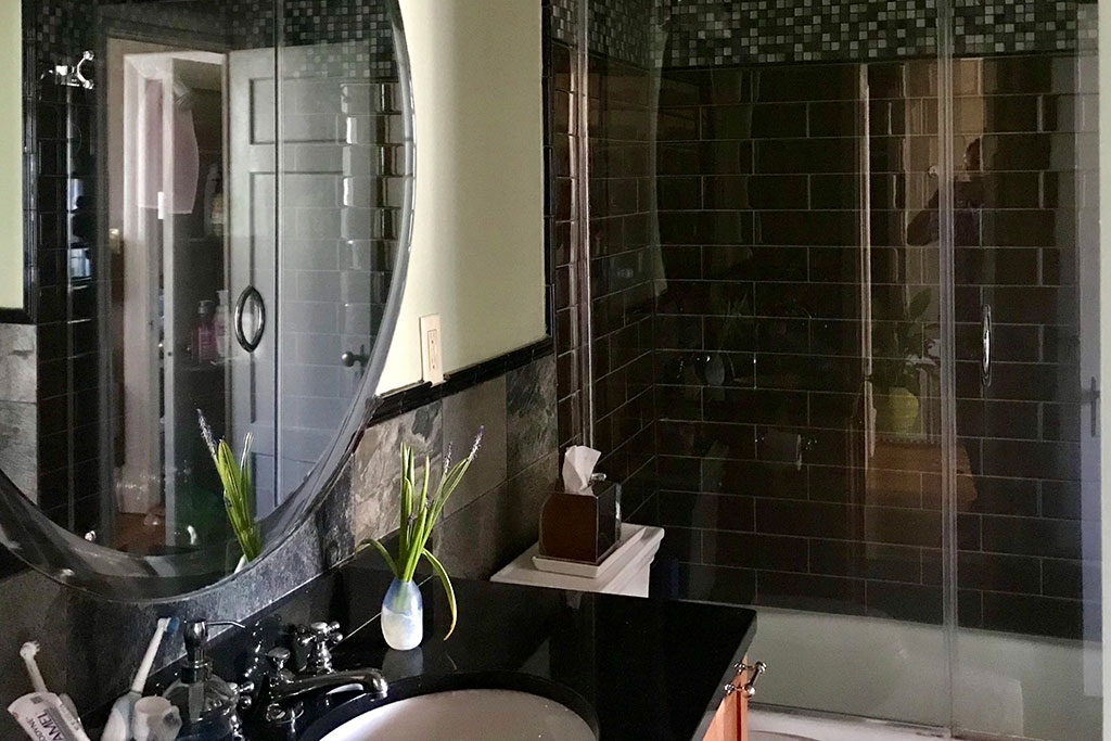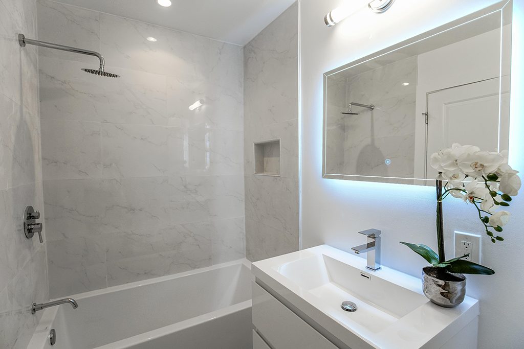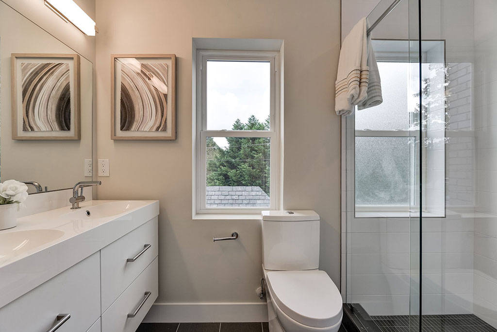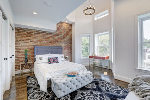 The owner’s suite has 12 ft ceilings and provides a wonderful cityscape through Marvin windows framed by storage, book shelves and bench seating — a perfect nook. Dueling closets to the ceiling guide you to the marble clad owner’s bath which sports custom glass shower doors, a giant custom vanity, sconce lighting and a large soaker tub w/skylight.